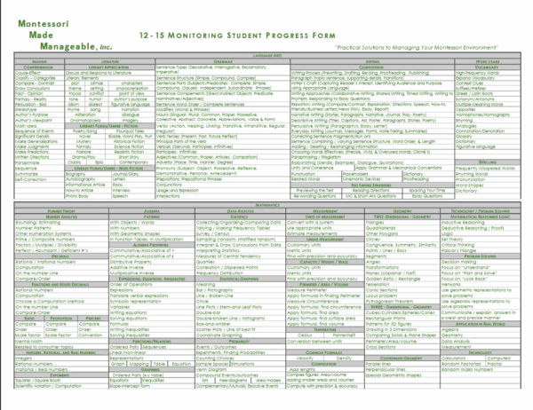 A thoughtfully designed system of tracking an individual student’s progress through nine years of the Montessori Curriculum